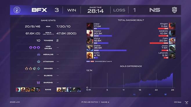 4세트, BNK 피어엑스가 '랩터' 리 신의 날카로운 갱킹을 통해 미드와 바텀에서 연달아 킬을 올렸다. 무리한 바텀 다이브로 손해를 보기도 했지만, 드래곤 스틸에 이은 추가 킬로 곧장 만회한 BNK 피어엑스는 '칼릭스'의 스몰더를 집요하게 노리며 농심 레드포스를 압박했다. 11분 만에 미드 1차 타워가 밀렸고, 스몰더는 이미 3데스를 누적했다.