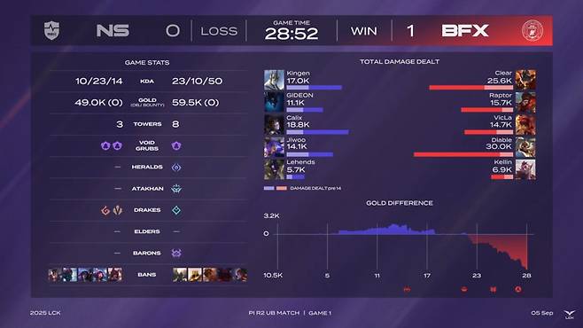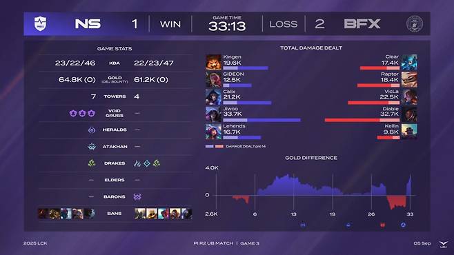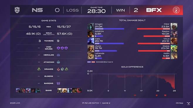 '킹겐'의 요릭이 좋은 드리블로 팀의 첫 킬을 신고하고, '빅라' 이대광의 탈리야를 상대로 솔로 킬을 터트리긴 했지만, 팀의 분위기를 바꾸기엔 역부족이었다. 이미 3용을 쌓은 BNK 피어엑스는 아타칸까지 노렸고, 농심 레드포스는 아타칸과 드래곤 영혼을 수비하는 과정에서 손해를 누적했다. 그렇게 큰 격차를 벌린 BNK 피어엑스가 세트 스코어 2:0을 완성했다.