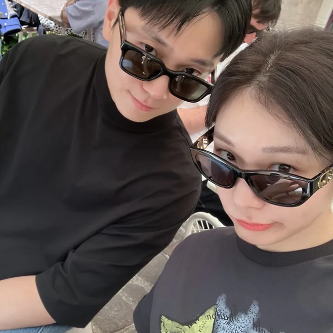 그래픽 티셔츠 + 블랙룩 (강변 셀카)연아는 달과 별이 그려진 네이비 티셔츠에 화이트 백을 매치해 발랄함을 더했고, 고우림은 선글라스를 쓴 올블랙 코디로 무게감을 잡았다.