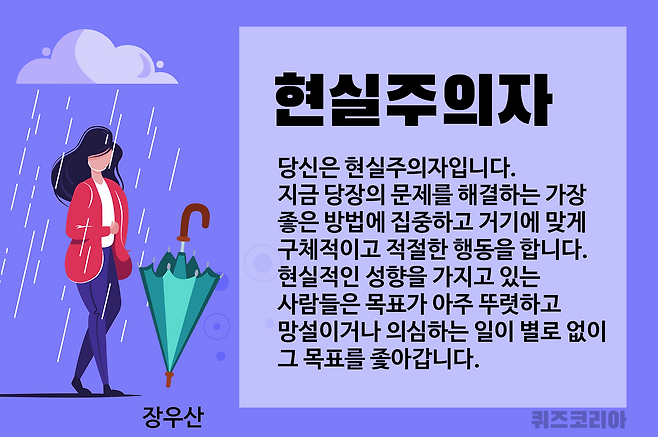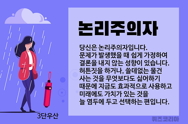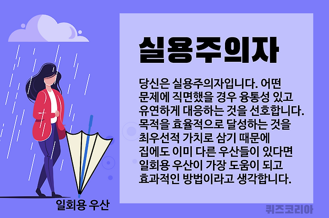 외출을 했는데 갑자기 비가 내립니다. 비가 그치기를 기다려 봤지만 비가 그칠 기미가 보이지 않습니다. 가까운 편의점에 들어가 우산을 하나 구입해야겠습니다. 어떤 우산을 구입하는지에 따라 내 성격이 보입니다.