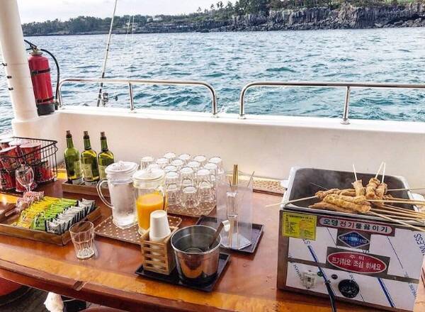 탑승 전 안전 교육과 투어 중 진행되며 간단한 간식과 음료, 생맥주, 와인 등이 무제한으로 제공되어 제주 특산 라면과 어묵탕와 선상 낚시 체험도 진행해 특별한 경험을 즐길 수 있습니다.