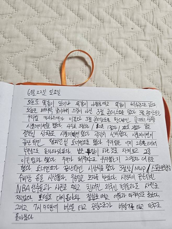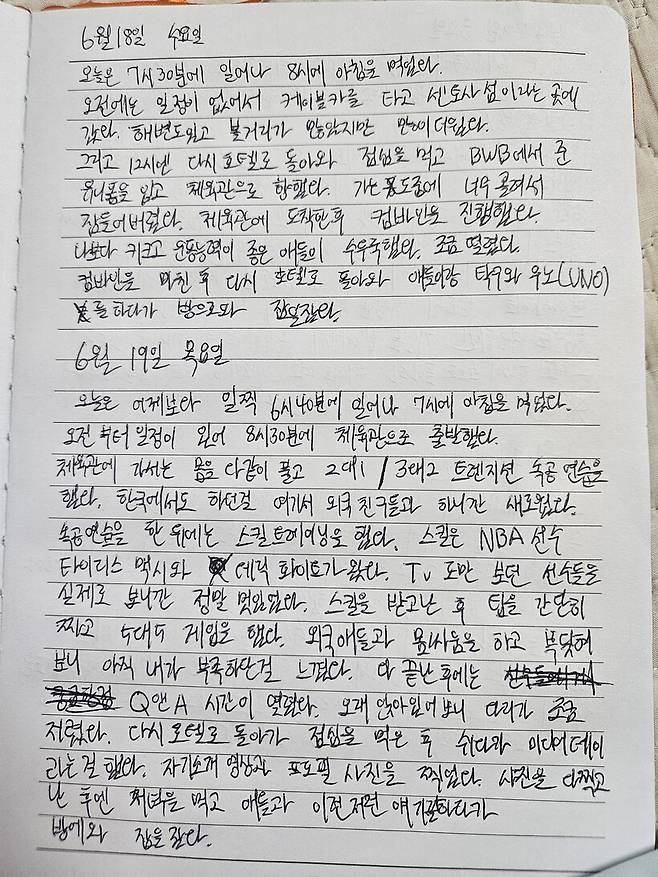 이들은 부족한 점을 위해 성장의 시간을 보내기도, 콧구멍에 바람을 쐬러 싱가포르 시내로 나들이를 하기도 했다. 낙생고 2학년 빅맨 유하람(204cm,C)도 이번 캠프에 초청 받아 데릭 화이트와 타이리스 맥시 등을 비롯해 NBA 유명선수와 코치진에게 전문적인 지도를 받았다. 짧지만 하루 하루가 소중했던 3박 4일, 유하람은 이번 캠프에서의 하루하루의 이야기를 일기로 남기며 기억을 간직했다. 유하람을 설득해 싱가폴에서의 농구일기를 입수했다. 유하람이 캠프에서 쓴 농구일기에는 무엇이 들어있을까.