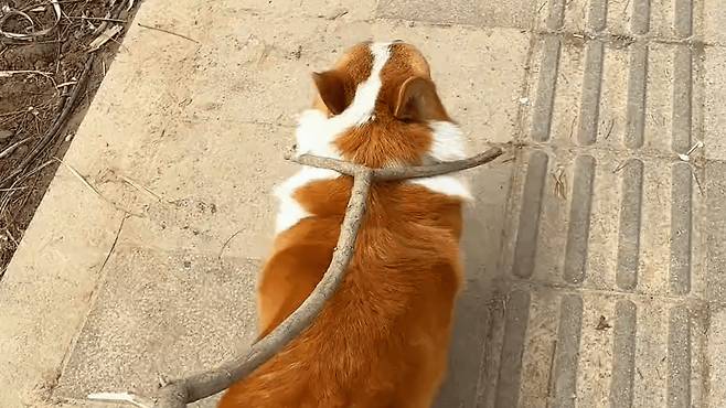 그런데 이 나뭇가지가 좀 특별했는데, 끝부분이 작은 포크처럼 두 갈래로 갈라져 있었죠. 견주는 번뜩이는 아이디어로 강아지의 목을 이 나뭇가지 ‘포크’로 살짝 끼워서 강아지를 리드하기 시작했습니다!