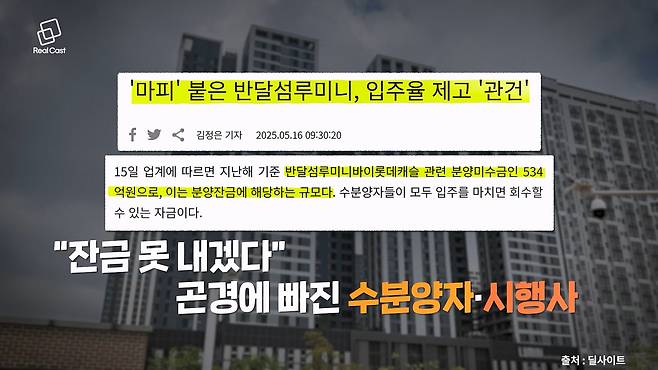 대기업 브랜드 아파텔도 속수무책입니다. ‘반달섬 루미니 바이 롯데캐슬’ 전용 84㎡는 5억 122만 원 매물이 등장했습니다. 분양가 대비 마피만 1억 2천만 원입니다. 보도에 따르면 이 단지는 분양미수금만 534억 원에 달합니다. 분양률은 92%가 넘었으나 수분양자들이 잔금을 못 치르고 있는겁니다.