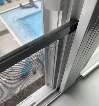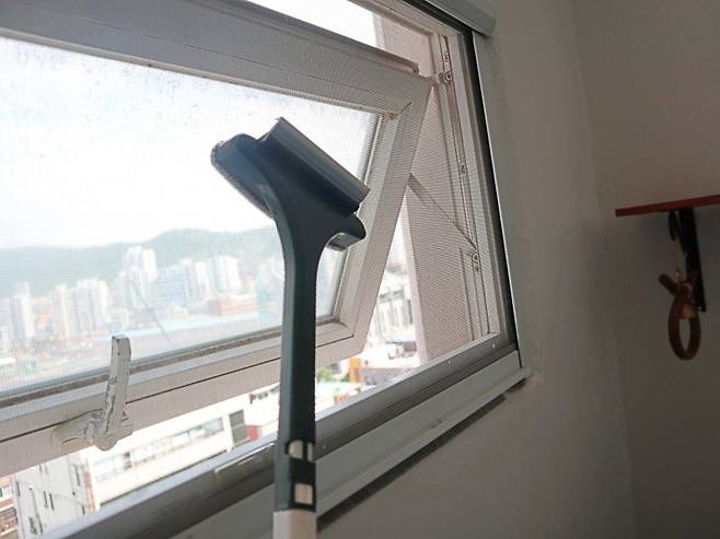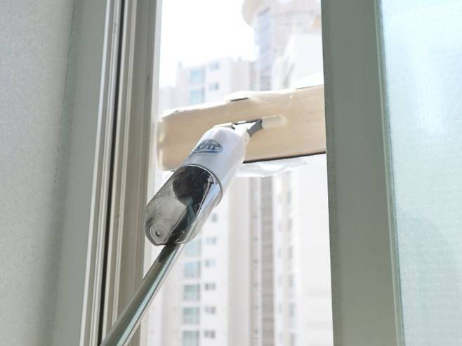 5. 방충망 닦기: 방충망에 밀착시킨 후 위에서 아래로 부드럽게 닦아줍니다. 너무 힘을 주면 방충망이 찢어질 수 있으니 주의합니다. 이때 떨어지는 먼지는 창틀에 떨어지는데, 마지막에 함께 청소하면 됩니다.
