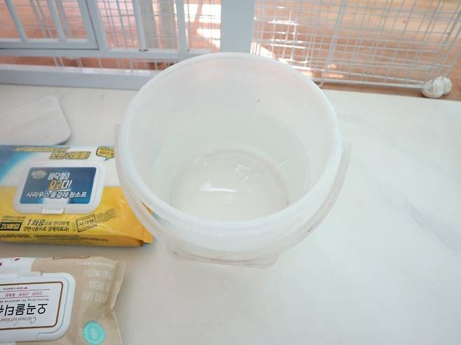 3. 물 적시기: 밀대에 고정한 물티슈를 세제 물에 담가 물기를 살짝 제거합니다. 물이 너무 많이 흐르면 작업이 불편할 수 있습니다.