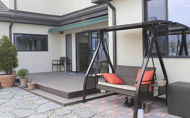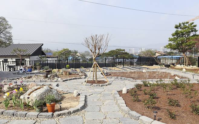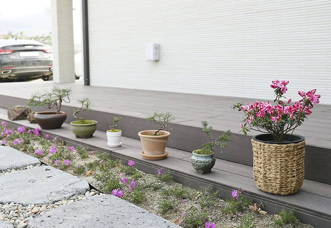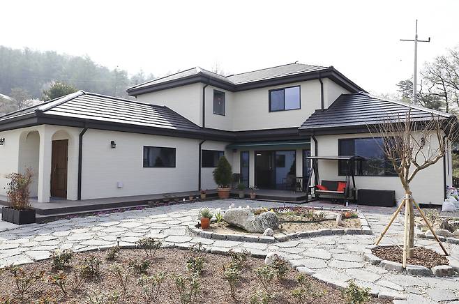 주택의 첫인상은 Cozy&Modern이었다. 밝은 아이보리 컬러 외벽에 블랙 컬러 평기와가 포인트가 돼 편안하면서도 모던한 느낌을 받았다. 가장 먼저 마주한 곳은 마당에 잘 가꿔진 정원이었다. 건축주는 정원을 가꾸는데 하루를 보낼 정도로 애정을 갖고 정원을 돌본다고 한다. 마당 중앙에 방사형으로 조성된 밭과 주택 울타리를 따라 심어진 제철 꽃, 고유의 멋을 뽐내는 소나무, 푸른 새싹과 채소들이 돋아나고 있는 텃밭까지. 진정 전원 라이프를 즐기는 사람의 집임을 느낄수 있었다.