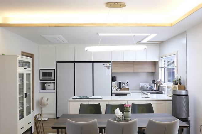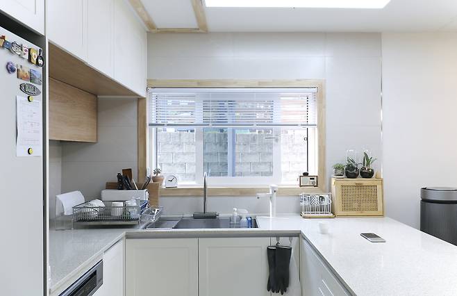 이러한 부분은 결과물에 고스란히 드러나기 마련이다. 건축주와 인터뷰 전 촬영을 진행하면서도 부엌 상판 높낮이가 일반적인 주택과는 달랐고 수납구성, 공간 배치에 심혈을 기울였음을 느낄 수 있었다. 버리는 공간 하나 없이 적절하게 활용했음에도 ‘투 머치’한 느낌은 전혀 없었다. 건축주는 집에서 지내면서 편안함을 느꼈으면 했고, 특히 주부는 공간을 어떻게 쓸지 공간 활용이 중요하기 때문에 주방과 세탁실, 팬트리 공간을 넉넉하게 구성했다고 언급했다.