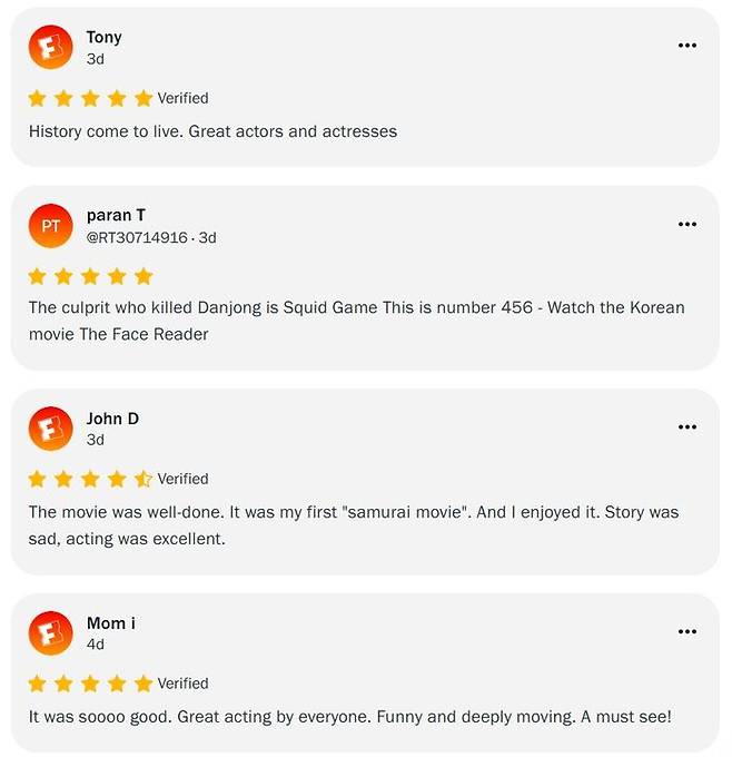 한 북미 관객은 "단종을 죽인 사람은 '오징어 게임'의 456번이다. 한국 영화 '관상'을 보세요"라는 한줄평을 통해 '왕과 사는 남자'와 '관상'을 연결시켰다.