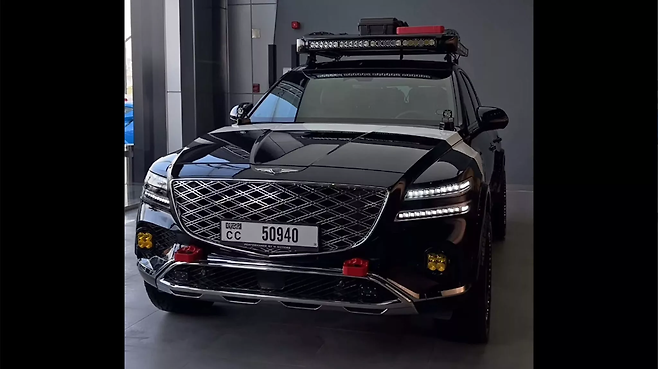 영상에서는 휀더 확장 키트, 루프랙에 추가된 LED 조명, 그리고 범퍼 흡입구에 설치된 노란색 라이트가 확인된다. 또한, 재키 익스는 SUV에 설치된 야간 투시 시스템에 대해 언급하기도 했다. 실내는 제네시스 브랜드의 특징인 고급 소재와 마감이 적용된 모습이다.