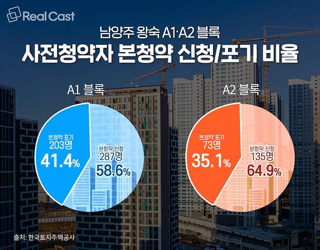 블록별로 보면, A1블록은 490명 중 287명(58.6%)에 불과했으며, A2블록은 208명 중 135명(64.9%)이 본청약에 나서며 상대적으로 높은 수치를 보였습니다.