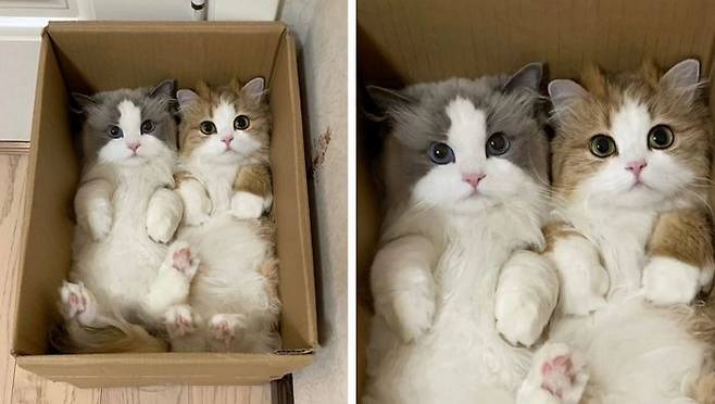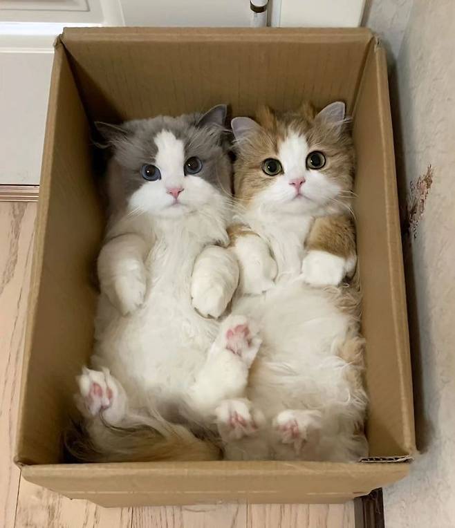 고양이들이 종이박스에서 나올 생각을 하지 않네요 ㅋㅋ
