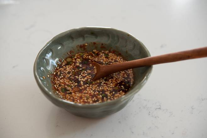 3. 그 사이 간장, 고춧가루, 다진 파, 다진 마늘, 참기름, 깨를 섞어 양념장을 준비한다.