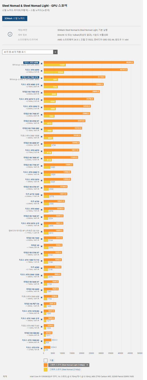 <스틸 노마드 4K> 벤치마크 결과(위 차트에서 노란색 막대기)를 보시면 현존 최강 RTX 4090이 순정 상태에서 딱 1만점 언저리에 있습니다. 참고로 RTX 4090이 타임 스파이에서는 제품에 따라, 또는 오버클럭 정도에 따라 3만 6,000 ~ 4만점 전후였는데 점수가 1/4 수준으로 줄었습니다.