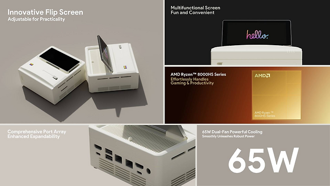 기존 보급형인 AM01은 AMD 라이젠 3200U나 5700U가 탑재되고, 메모리는 DDR4였습니다. 썬더볼트나 USB4도 지원하지 않았구요. 그리고 제품 케이스에 디스플레이도 없었습니다. 디스플레이처럼 보이는 부분은 검은색 플라스틱 판일 뿐이죠.