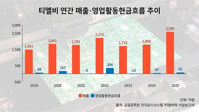 실적 흐름을 보면 이번 유증은 단기 자금난 해소보다는 중장기 투자 재원 마련의 성격이 짙다. 티엘비의 지난해 연간 연결 기준 매출은 2585억원, 영업이익은 260억원으로 전년 대비 각각 43.6%, 673.2% 늘었다. 영업활동현금흐름도 2023년 마이너스에서 2024년 양수전환에 성공했고 지난해 말에는 전년 대비 74.2% 증가한 82억원을 기록했다. 고부가 제품 비중 확대와 AI 서버향 수요 증가가 실적 회복을 뒷받침한 것으로 풀이된다.