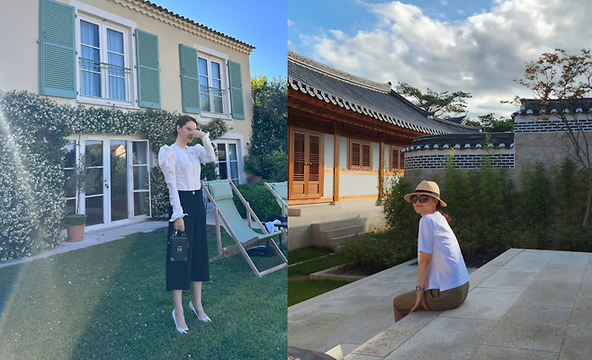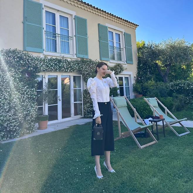 첫 번째 사진에서 이영애는 프로방스 스타일의 주택을 배경으로 우아한 화이트 블라우스 룩을 연출하고 있다. 퍼프 슬리브가 돋보이는 화이트 블라우스와 네이비 미디 스커트의 조합으로 클래식한 매력을 선보이고 있으며, 작은 핸드백과 포인티드 토 힐로 세련된 완성도를 보여주고 있다.