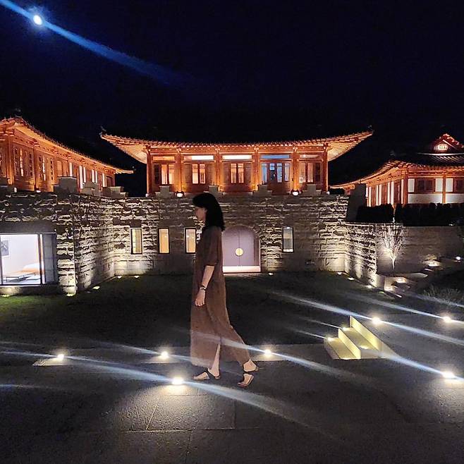 두 번째 사진에서는 한국 전통 건축물을 배경으로 브라운 톤의 롱 드레스를 착용해 동양적 우아함을 연출하고 있다. 야간 조명과 어우러진 차분한 브라운 컬러의 드레스는 전통미와 현대적 세련미를 동시에 표현하며, 미니멀한 스타일링으로 고급스러운 분위기를 자아내고 있다.