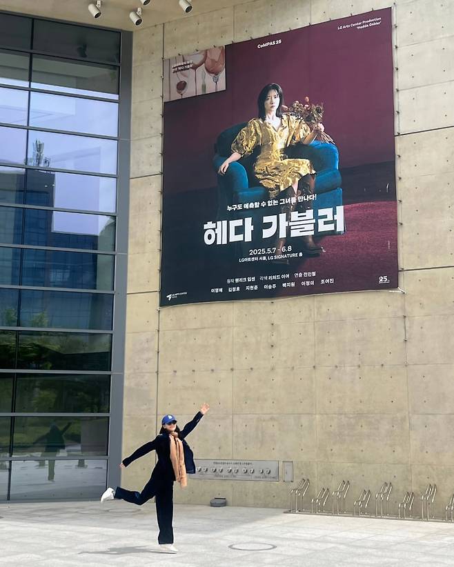 마지막 사진에서는 '헤다 가블러' 연극 포스터 앞에서 네이비 재킷과 베이지 팬츠, 야구 모자를 착용한 스포티 캐주얼 룩을 선보이고 있다. 점프 동작으로 활기찬 에너지를 표현하며, 편안하면서도 스타일리시한 일상 패션의 매력을 연출하고 있다.