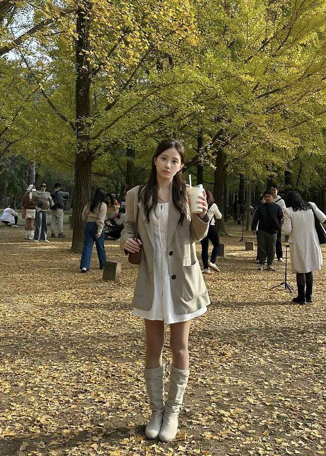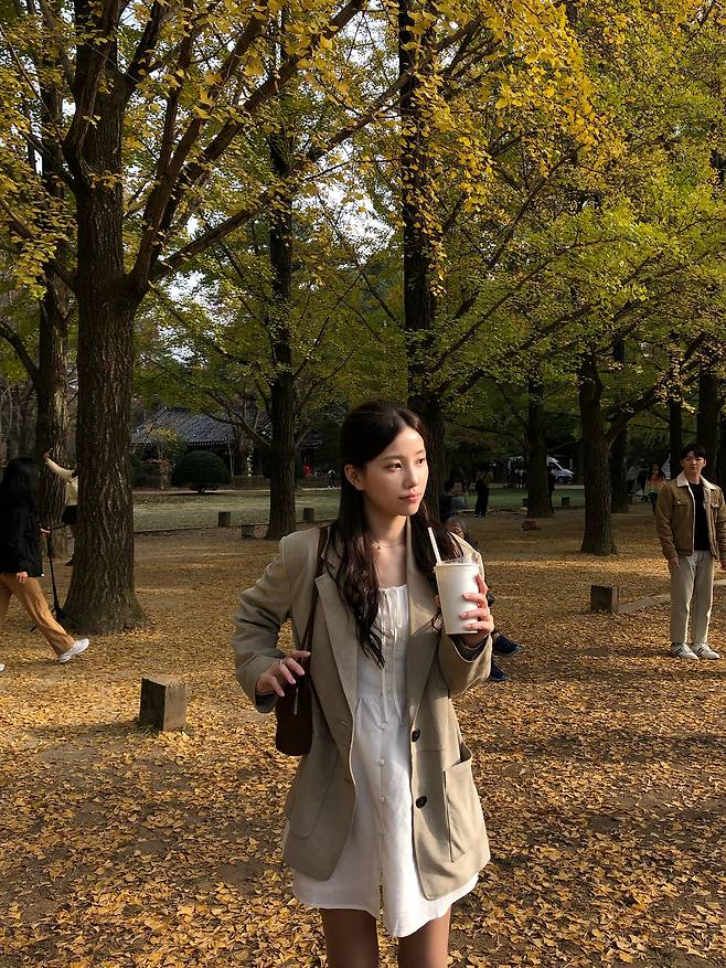 이 코디에 화이트 백을 매치해 주면 베이지 톤온톤 무드에 녹아들어