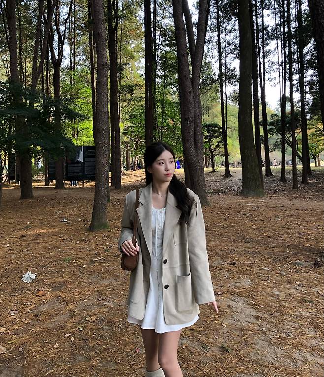 저는 누구나 잘 어울리는 베이지 톤 스웨이드 재킷에 화이트 원피스를 매치해 화사함을 더했습니다.