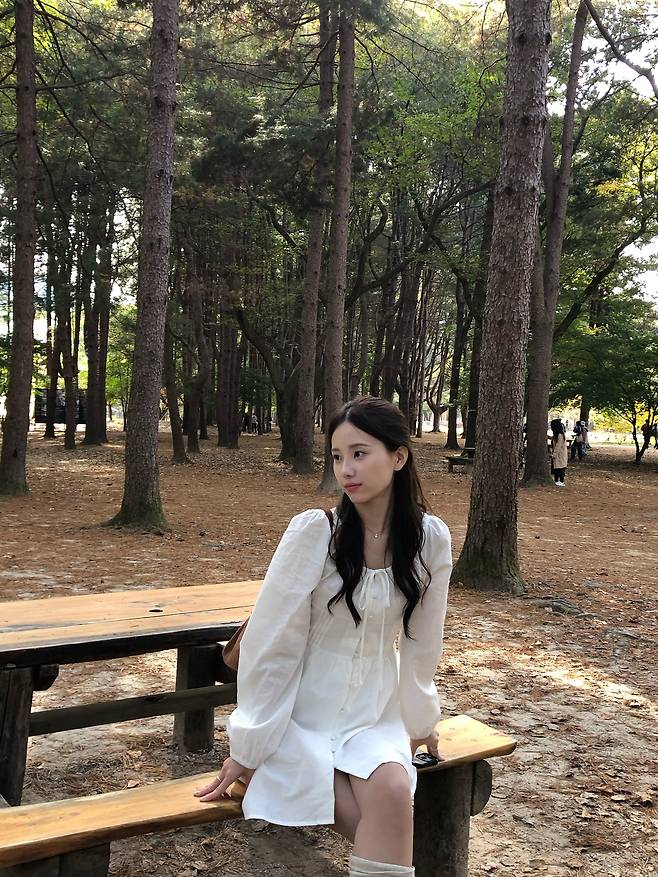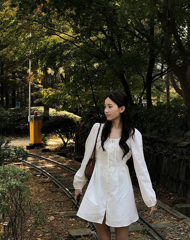 이너로 매치한 화이트 원피스는 깔끔하고 청순한 분위기를 줍니다.