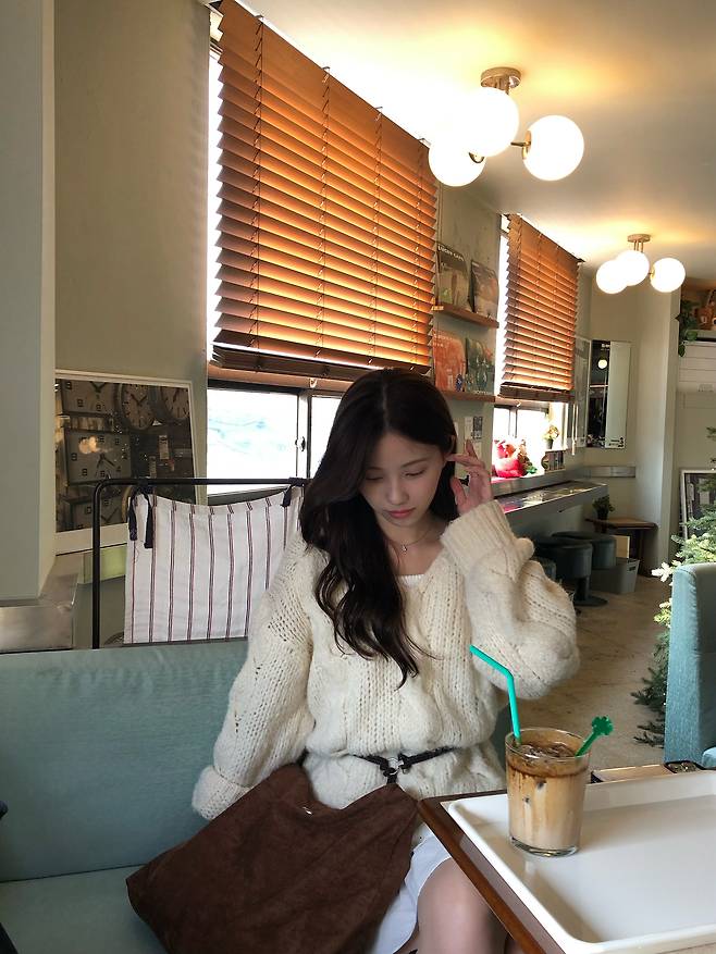 두 번째는 청순하면서도 여리여리한 느낌을 주는 오버핏 니트와 미니스커트 코디입니다!