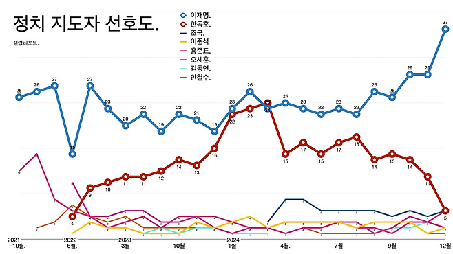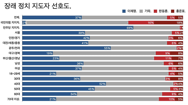 - 장래 지도자 선호도에서는 이재명(민주당 대표)이 37%로 뛰어올랐고 한동훈(전 국민의힘 대표)은 5%로 급락했다. 홍준표(대구시장)가 5%로 동률이고 나머지는 경쟁 후보가 없는 상황이다.