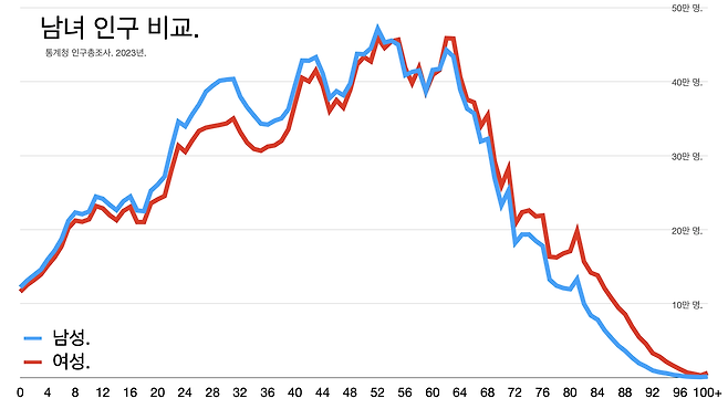 - 대략 55세 이후에는 여성 인구가 더 많습니다.