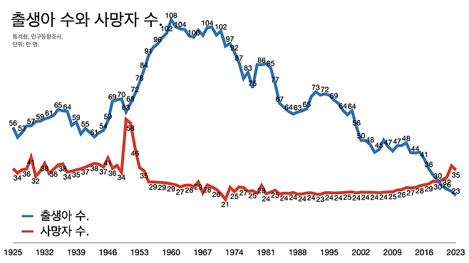 - 연도별 출생아 수입니다. 한 해 100만명까지 태어나기도 했는데 지난해에는 23만 명에 그쳤습니다. 일제 강점기나 한국 전쟁 때 보다 출생아가 적습니다.