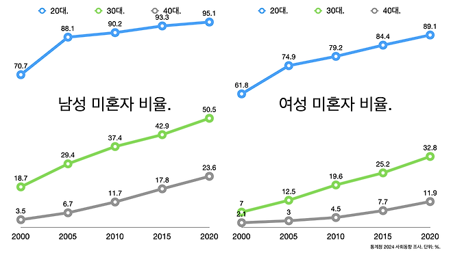 - 지난 금요일 슬로우레터에서 미혼자 비율을 비교한 그래프가 있었는데요. 다시 보니 세로 축 최대 값이 살짝 달라서 차이가 두드러지지 않았네요. 다음 그래프가 맞습니다.