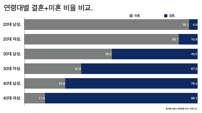 - 조금 다르게 그려봤습니다. 결혼을 못하거나 하지 않는 남성 비율이 상대적으로 높습니다. 40대 남성 네 명 가운데 한 명이 미혼입니다.