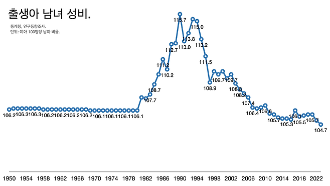 - 출생아 남녀 성비는 다음과 같고요. 자연 성비가 105 정도라고 하니까 한국은 남아 선호 현상은 거의 사라졌다고 할 수 있습니다.