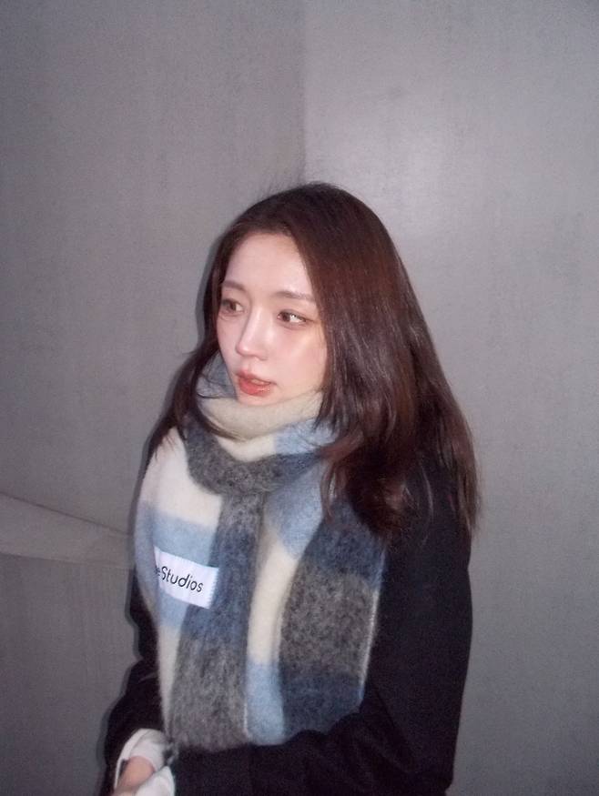 성해은이 차분한 그레이 톤의 벽을 배경으로, 그녀만의 맑고 청순한 매력이 돋보이는 감성적인 겨울 근황을 전했어요.