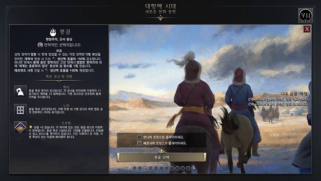 마치 겨우 허들을 넘어서 이제 시원하게 다릴 준비를 하고 있는데 또 다른 허들이 보이는 격입니다. 문명 초보자에게 있어 문화 선택의 신선함이 반대로 문명7에서 손을 떼게 만드는 요인으로 작용하지 않을까 싶습니다.