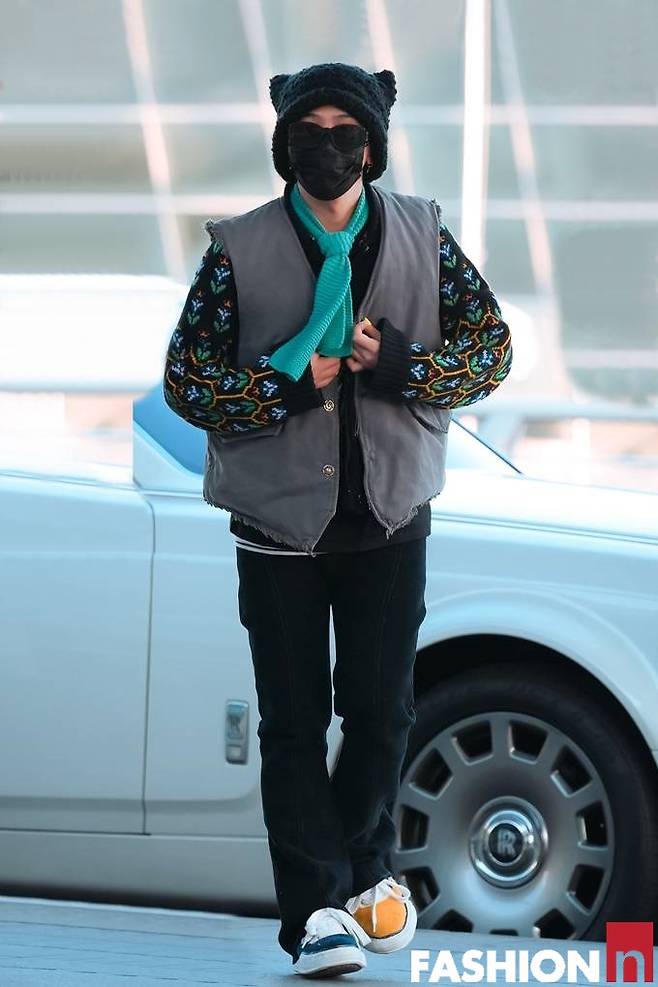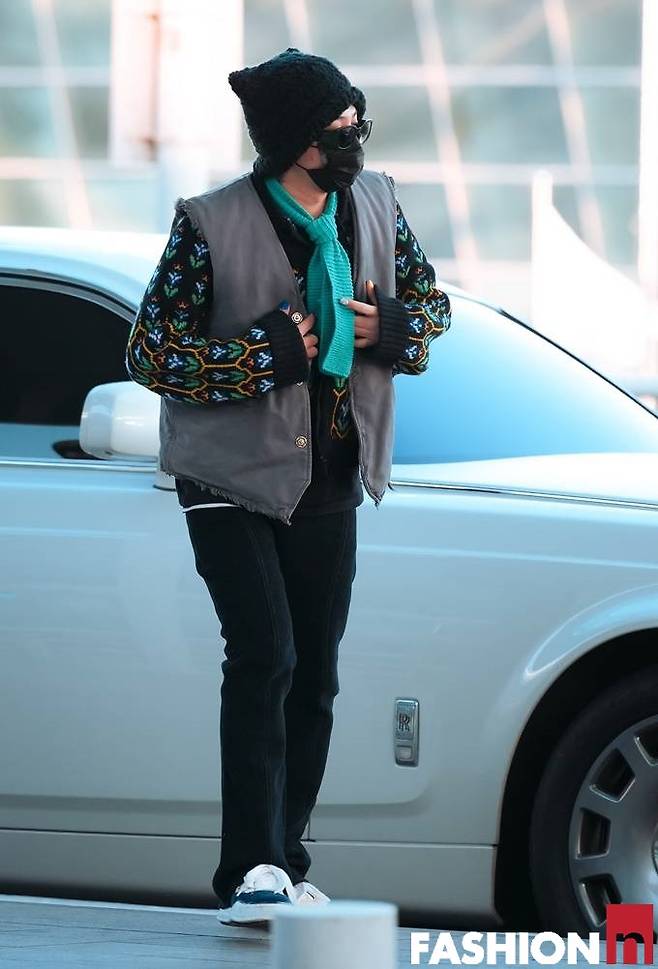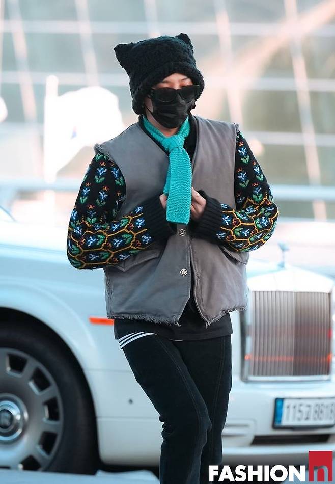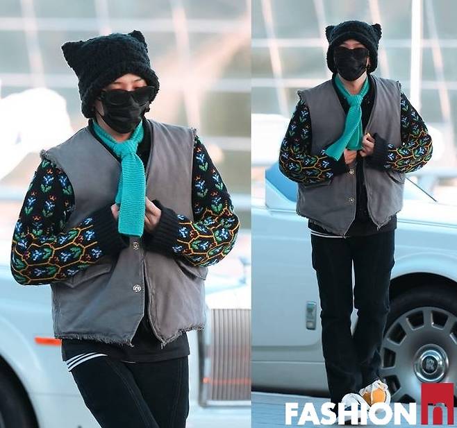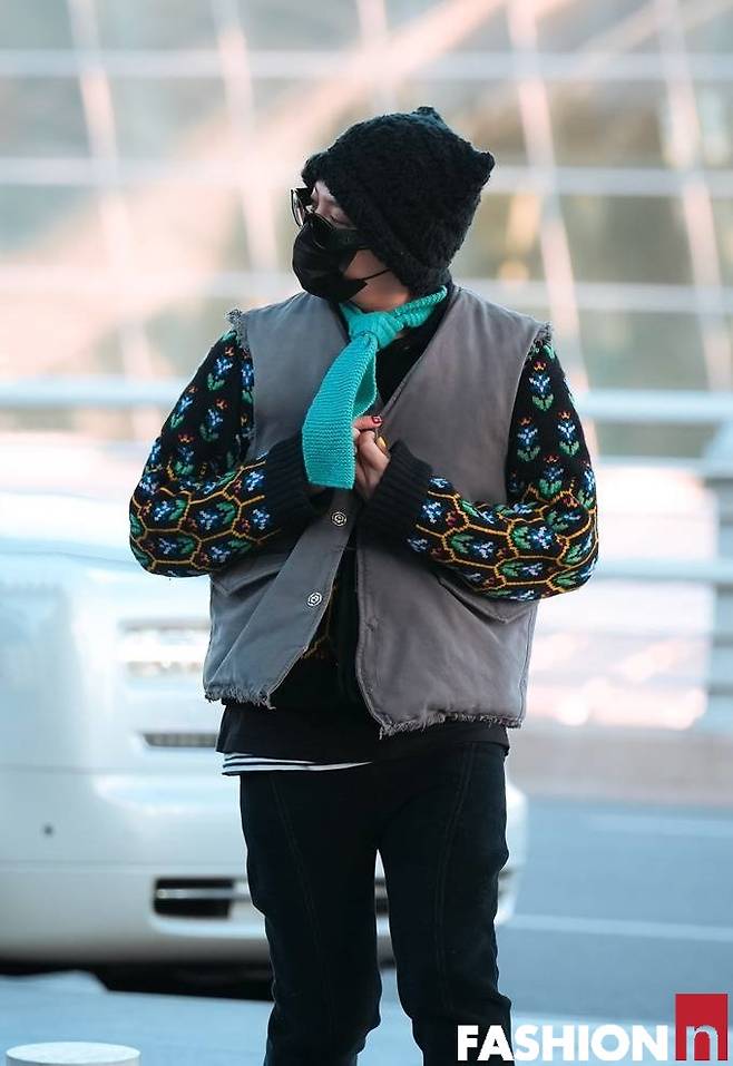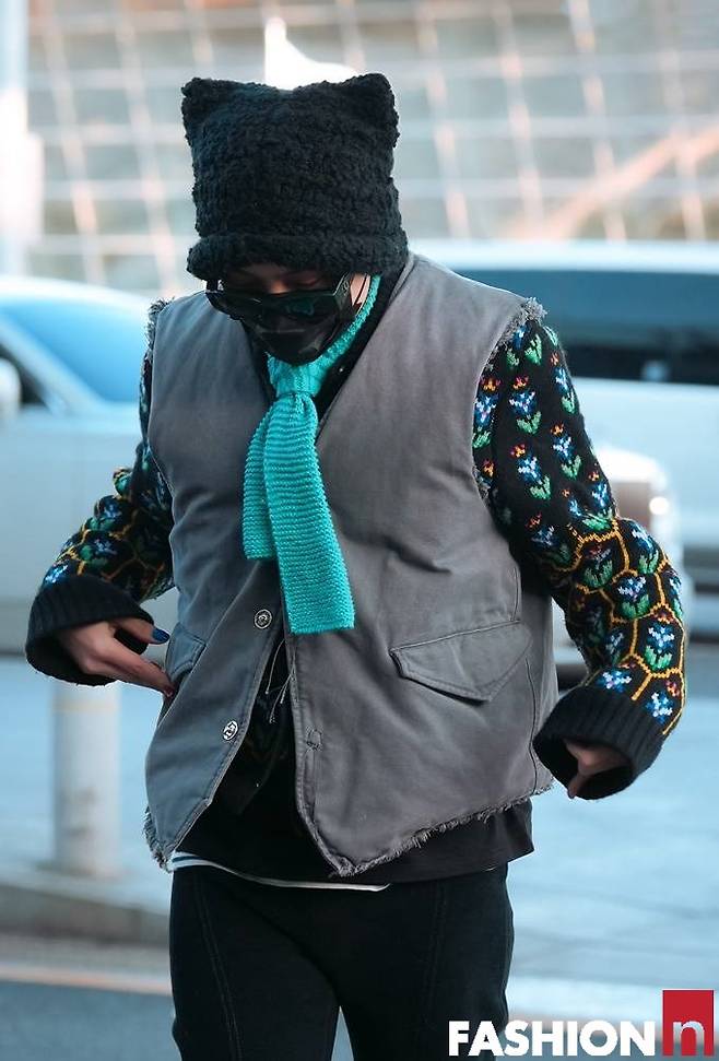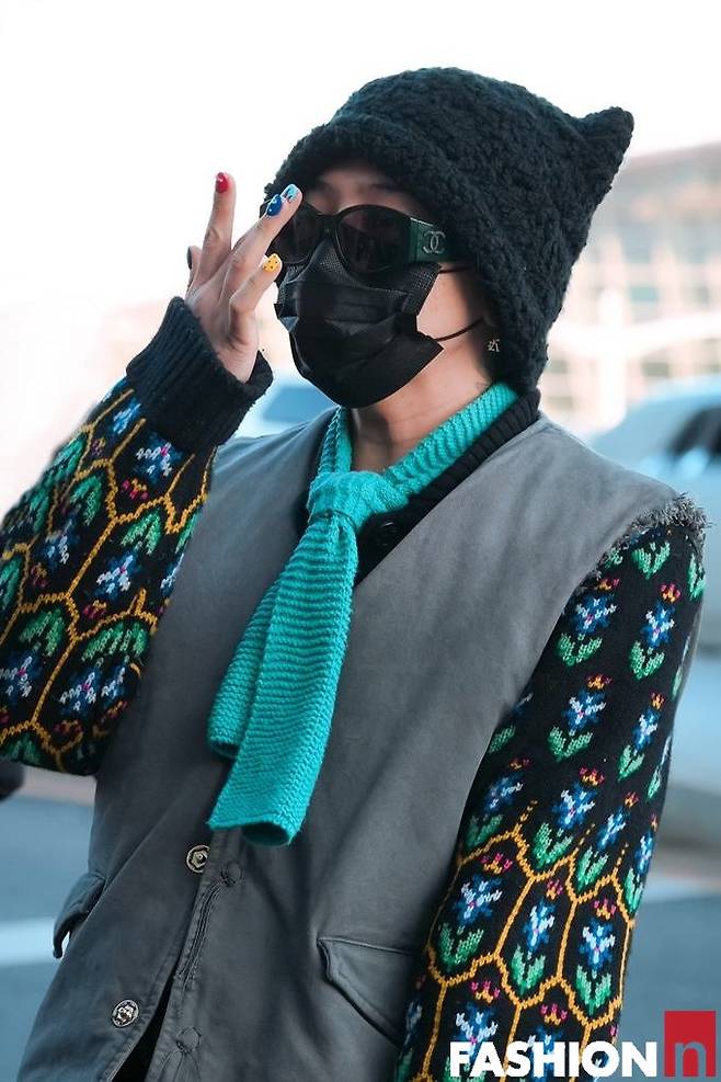 이날 지드래곤은 패딩 베스트와 토끼 모자, 여기에 하늘색 니트 타이, 칼라가 다른 운동화까지 자신의 개성을 결합한 젠더 플루이드룩으로 패션감각을 발휘했다. 특히 컬러플한 매니큐어도 눈길을 끈다.
