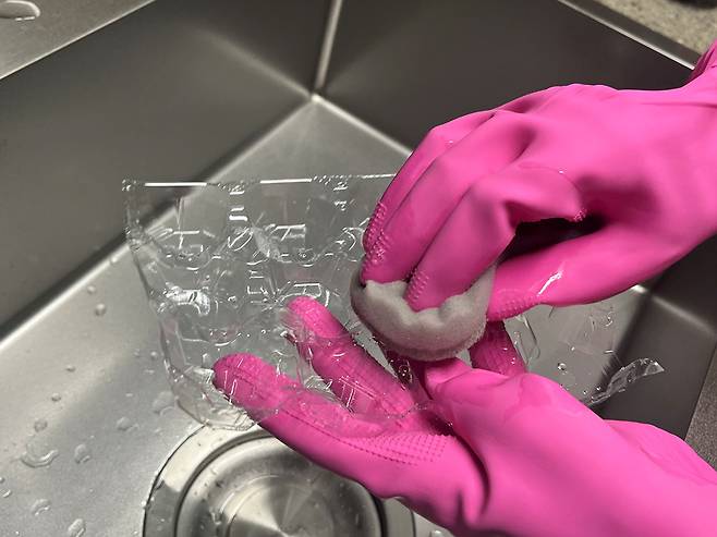 계란을 덮었던 뚜껑은 계란 넣을 밀폐용기 사이즈에 맞게 자르세요. 그리고 주방세제로 가볍게 닦아주세요. 계란 겉면에 묻어있을 수 있는 눈에 보이지 않는 세균들을 제거하고 쓰는 것이 좋습니다.