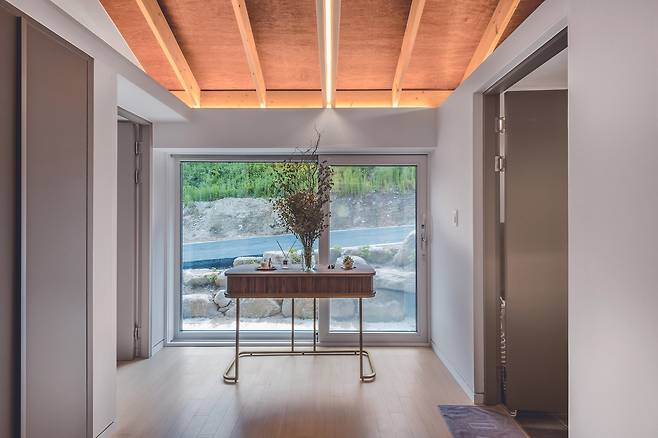 현관은 실내에서의 첫인상이자 동시에 환대 공간이기도 하다. 단지 신발을 벗고 실내로 스쳐가는 공간이 아니길 바랐다. 햇빛이 들어 밝고 따뜻한 기운을 주며 주변 풍경과 겹쳐 보이는 그런 풍성한 전실이 되길 바랐다.