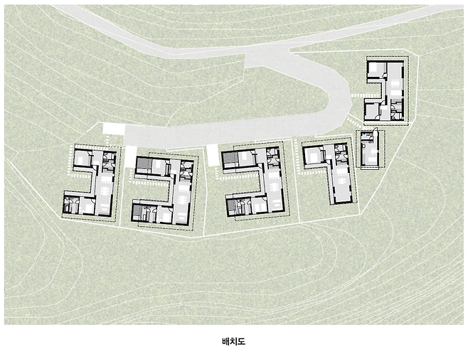 다음 계획의 본격적인 시작은 대지를 만지는 일부터였다. 진입 도로에서 경사져 내려간 대지는 고저 차가 있었기에 단지 내 경사 도로의 선형을 잡고 다시 그 도로와 연결되는 여섯 개의 대지로 나눴다.