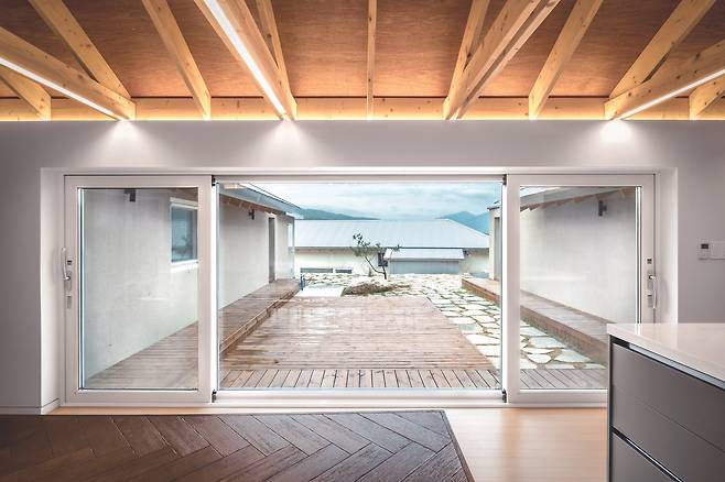 “이곳이 골짜기 지형이어서 바람이 많이 불어요. 근데 이 마당에 들어오면 바람이 들지 않아 너무 편안해요. 대문, 담장이 없어 걱정이기도 했는데 보호받는 느낌도 들고 앞집 지붕이 낮아 전망을 가리지 않아 답답하지도 않고 너무 좋아요.”