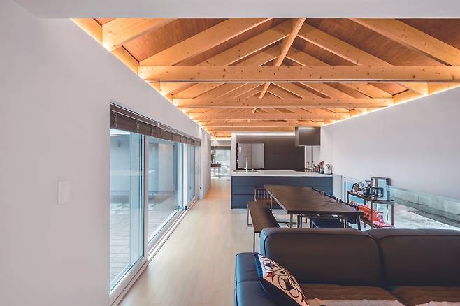 거실·식당·주방은 벽으로 구획해 단절하기보다는 하나의 큰 공간에서 커뮤니티가 발생하는 공간이기를 바랐다. 이곳에서는 마당으로 난 큰 창문을 통해 실내가 밖으로 확장되고 마당과 남쪽 진안고원산맥이 한눈에 담긴다. 박공지붕 형태를 그대로 살려 층고를 확보해 트인 공간감을 더했고 천장 목구조를 노출시켜 벽과 대비되는 구조미를 드러냈다.