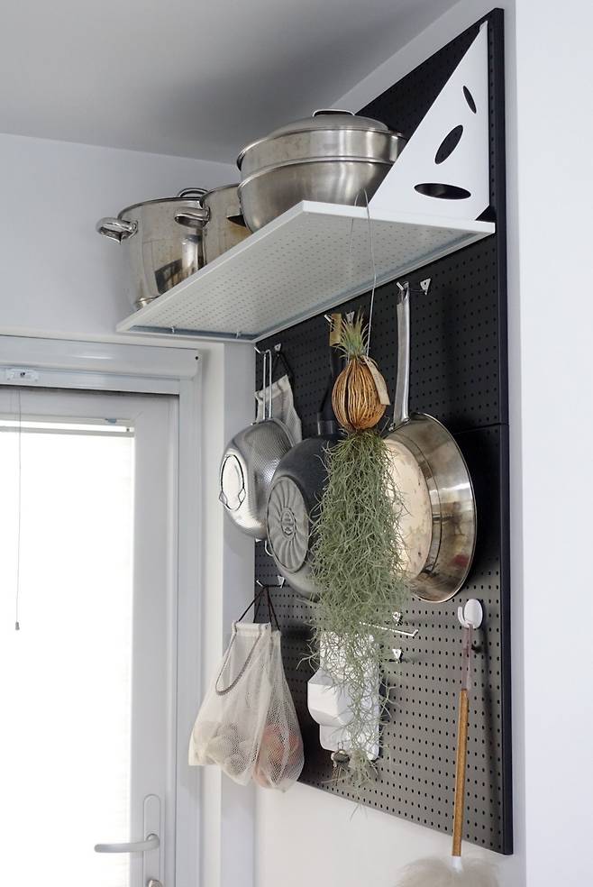 주방 구조는 몇 번을 지우고 다시 그렸다. 그녀에게 주방은 단순히 요리하는 공간 그 이상이다. 동선에 맞춰 설계된 수납과 배치, 그리고 손에 익는 높이의 조리대가 오랜 고민과 정성의 결과를 보여준다. 냉장고 오른편에는 타공판을 설치해 추가 수납 공간을 만들었고, 위 보드는 모두 정확한 사이즈로 맞춰 시공했다.