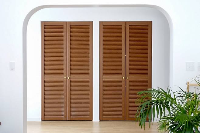 현관을 지나 복도로 들어서면 따뜻한 느낌의 우드 컬러와 베이지 톤이 맞아준다. 그녀가 강조한 건 ‘따뜻하고 아늑한 집’이다. 맞춘 듯 은은하게 이어지는 톤 속에, 곳곳의 포인트들이 자연스럽게 존재감을 드러낸다. 복도의 한쪽 벽은 라운드 처리를 통해 부드러운 분위기를 만들고 붙박이장은 문고리 크기까지 다르게 설계해 위트를 더했다.