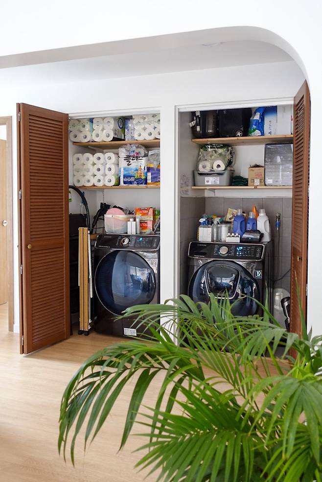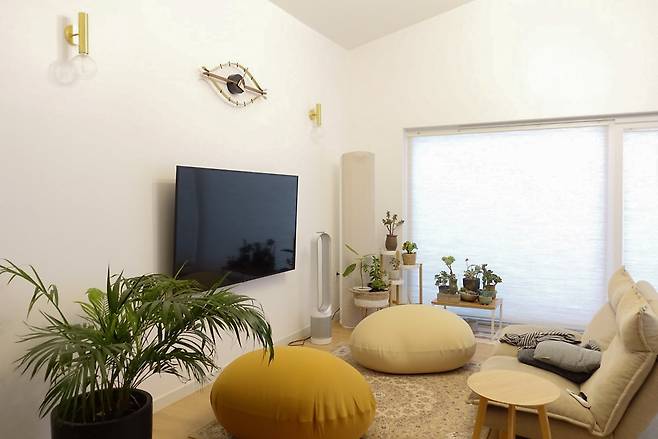 세탁기와 건조기를 안에 숨기듯 넣고, 청소기·스팀다리미 등 살림소품은 깔끔하게 보관한다. 거실은 프레임처럼 이어지는 구조 속에서, 다육이 식물과 빈백이 포근한 분위기를 조성한다. TV 옆 벽에는 자연소재로 만든 트리 장식이 붙어 있다. 인위적인 화려함보다는 이 집에 어울리는 소박한 멋이 곳곳에 배어있다.
