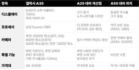하지만 매년 여러 모델이 출시되면서 A15, A25, A35, A55 등 숫자의 의미나 모델별 실제 차이점을 파악하기 어렵다는 목소리도 많습니다. 비슷해 보이는 모델 중 어떤 것을 선택해야 할지, 과연 고가 모델의 추가 기능이 그만큼의 가치가 있는지 결정하기 쉽지 않죠.