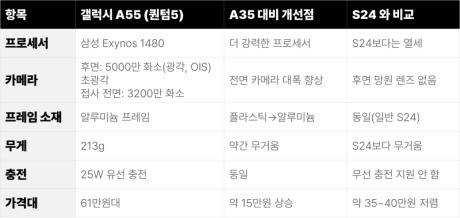- 프로세서 성능이 S24보다 약간 낮음- 망원 카메라가 없어 줌 성능이 제한적- 무선 충전 미지원- USB 3.2가 아닌 USB 2.0 사용그럼에도 불구하고 A55는 S24보다 약 35~40만 원 저렴한 가격으로 플래그십에 근접한 경험을 제공한다는 점에서 가치가 있다는 평가를 받는 모델입니다.