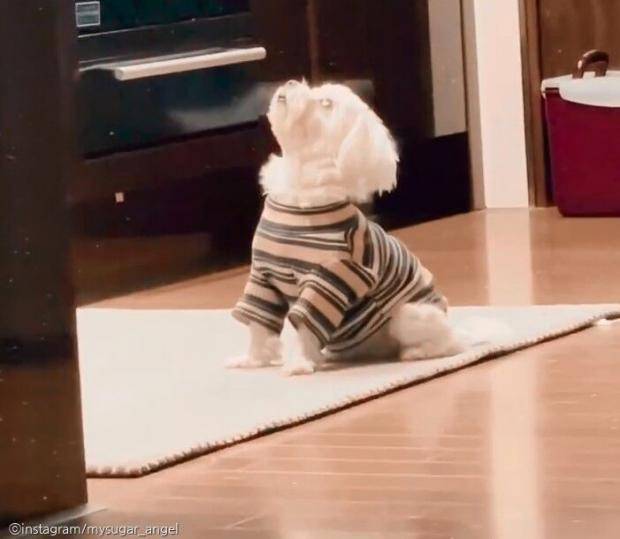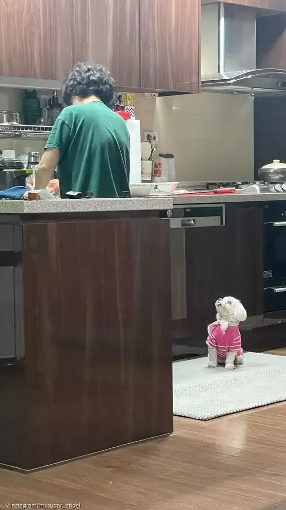 영상에는 작년 8월 세상을 떠난 보호자의 반려견 '설탕이'의 모습이 등장합니다. 영상 속 설탕이는 부엌 밑에 앉아 고개를 들어 식탁 위를 올려다보고 있는데요.