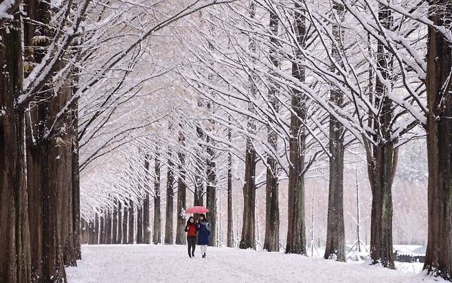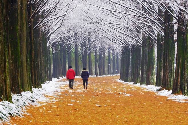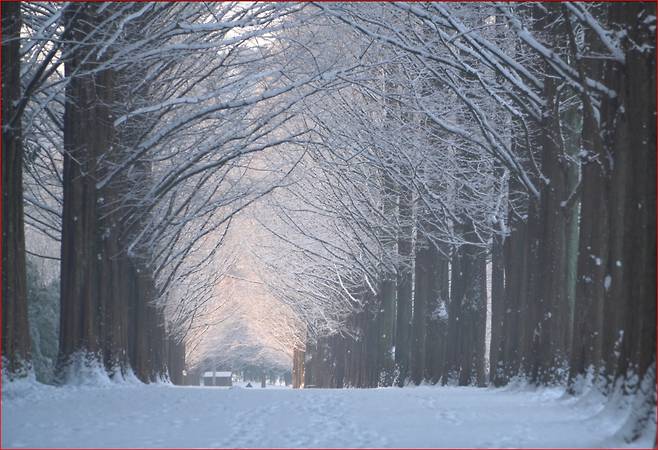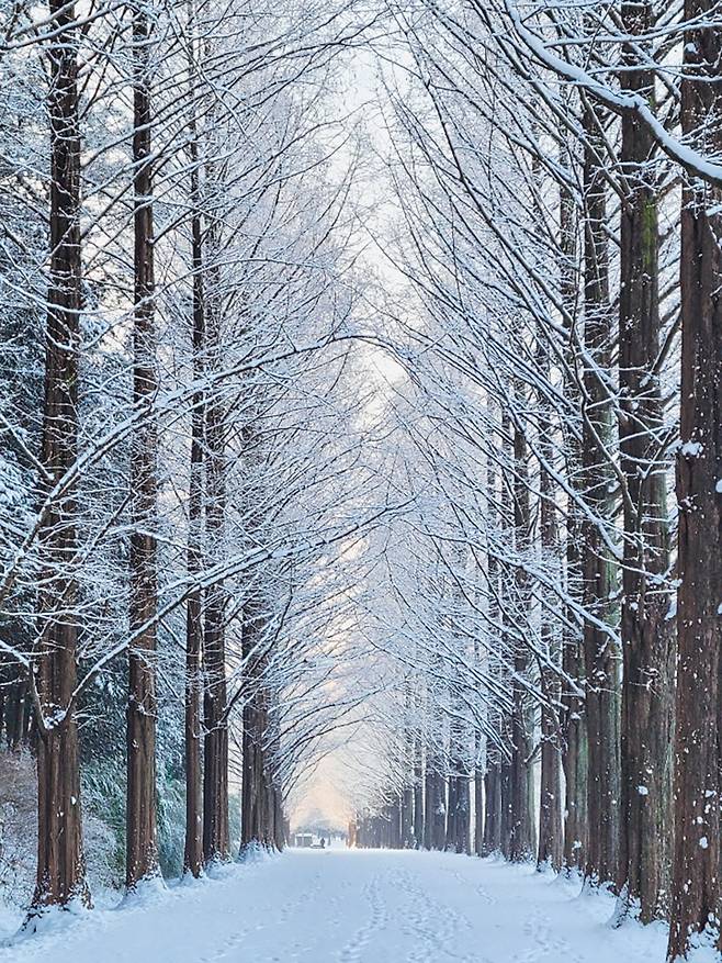 담양 메타세쿼이아길이 가장 깊은 인상을 주는 순간은 눈이 내린 다음 날입니다. 일정한 간격으로 줄지어 선 나무들이 설경과 만나면 원근감이 더욱 또렷해지고, 길 전체가 거대한 숲의 회랑처럼 변합니다.