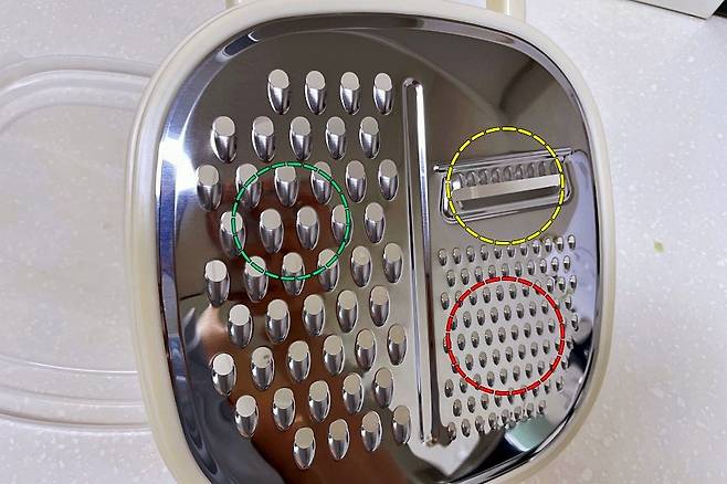 굵은 채칼, 얇은 채칼, 슬라이스 기능까지 3가지가 있는데요.