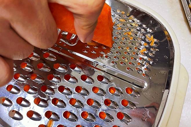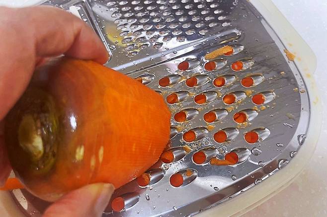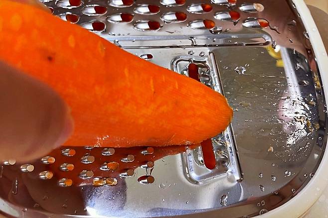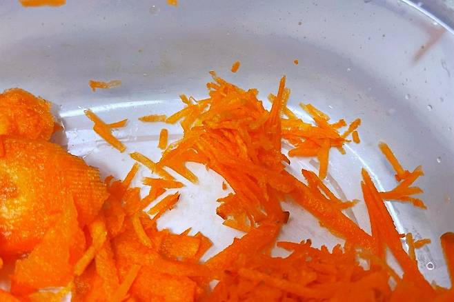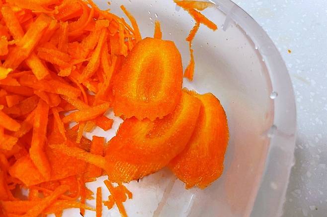 먼저 굵은 채칼로 당근을 썰었습니다.